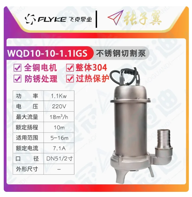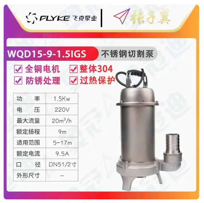 FLYKE WQD-IGS stainless steel tear type cutting sewage submersible pump WQD10-10-1.1IGS WQD15-9-1.5IGS